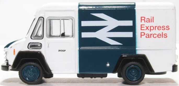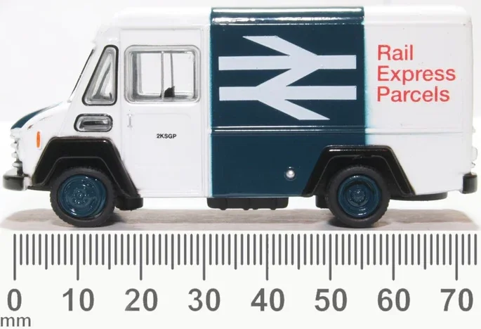Ons schaalmodel op 1:76 verschijnt als een Express Parcels-voertuig voor het spoor. Het is wit met koningsblauwe accenten op de zijkanten, motorkap en achterkant. Het voertuig, geregistreerd als LRR 592P uit 1975/76, draagt het British Railways Double Arrow-logo dat in 1965 werd geïntroduceerd. De wielen zijn donkerblauw, terwijl het interieur en de overige exterieurdelen in zwart zijn afgewerkt. De achterste rolluikdeur is ook donkerblauw gemaskeerd.