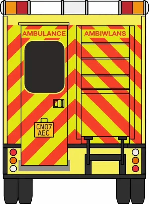 Deze Mercedes-ambulance, met kenteken CN07 AEC, is uitgevoerd in het moderne groen-gele ambulancekleurenschema met een rood-geel chevronpatroon aan de achterkant en zwart getinte zij- en achterruiten. Het chassis en interieur zijn geheel zwart. De tweetalige bewegwijzering toont Welshe teksten aan de buitenkant en Engelse aan de zijkant, terwijl op de voorkant het woord Ambulance in beide talen groen is gedrukt. Op het dak boven de voorruit zit een zilveren en blauwe lichtbalk met witte Ambulance-letters. Details zoals bumpers, radiatorrooster, deurgrepen, spiegels en andere kleine onderdelen zijn afgewerkt in matzwart of zilver, wat de realistische uitstraling van deze miniatuur versterkt.
