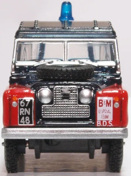 Er is geen twijfel over de functie van deze nieuwste versie van de Land Rover Station Wagon met lange wielbasis. Dit is serieus werk! In Royal Navy donkerblauw en wit, met rode accenten op de voorvleugels en achterwielkasten, speelt dit 1:76 schaalmodel een rol bij de Bomb Disposal Squad. Het rood-witte bord op de voorvleugel aan de bestuurderskant zegt genoeg. Met witte RN-logo’s op de buitenste vleugel en de Land Rover-deuren draagt het voertuig het militaire kenteken 67 RN 48. Handige extra’s zijn onder andere een lier op de voorbumper en een blauw zwaailicht op het dak. En vergeet het reservewiel op de motorkap niet. Een leuke toevoeging voor zowel Land Rover- als militairmodelliefhebbers.
