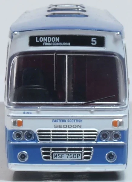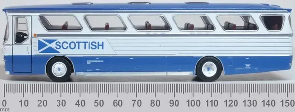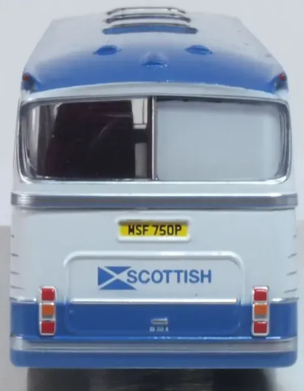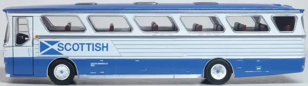 Een enkeldekkige rijtuig in de vorm van de Alexander M-Type. De M-Type was een snelwegbus gebouwd voor de Scottish Bus Group Anglo-Scottish diensten en hier in Oxford lanceren we de vloot met een voorbeeld van de bus die van Schotland naar Londen reist als nummer 5. Geregistreerd als MSP 750P uit 1975/76, is hij versierd in de felblauwe en zilveren Schotse kleurstelling met een gestileerde Saltire-vlag langs de zijkanten, witte wielen met blauwe centra, heldere dakramen in het felblauwe dak en veel zilveren accenten. Een interessant kenmerk is dat het achterraam aan de rechterkant van binnenuit wit is geschilderd, wat doet denken aan een kenmerk van veel langeafstandsrijtuigen waar privacy van passagiers vereist is!