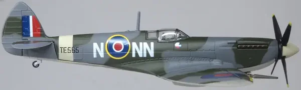 Onze 1:72 schaalreplica van deze iconische Spitfire stelt het toestel voor in de laatste oorlogsmaanden op RAF Manston. Het model draagt het klassieke donkerzeegrijs met camouflagegroen bovenop en donkergrijs eronder, met een groenblauwe staartband en spinner. Felgele accenten sieren de zwarte propellertoppen en de vleugelvoorranden, terwijl de kanonpatches helder rood zijn. De onderzijde van de loopopeningen is matzwart, de uitlaten zijn roestbruin en de banden matzwart met zilveren naven. Op de lichtgroene rompband prijkt in zwart ‘TE565’, terwijl de code NN-N groot aan beide zijden van de romp te zien is.
