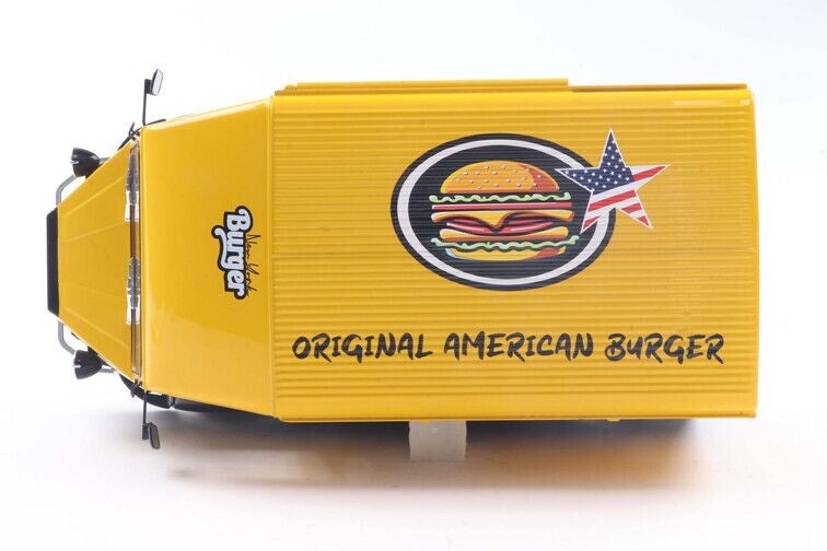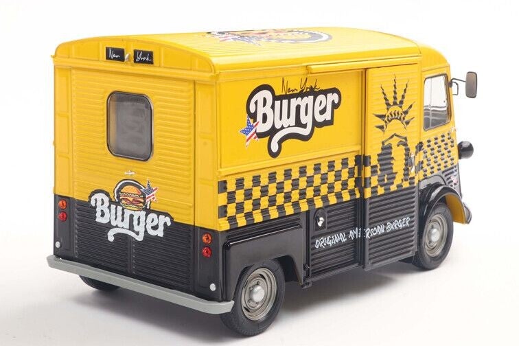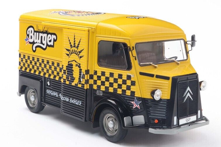 Solido schaalmodel van een 1969 Citroën Type HY “NYC Burger” foodtruck, uitgevoerd in schaal 1/18 en afgewerkt in geel en zwart.