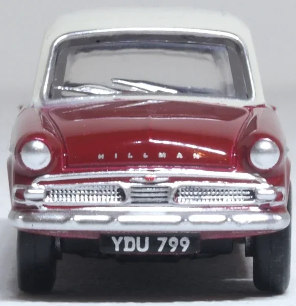 De Hillman Minx MkIIIA op schaal 1:76 is uitgevoerd in een vorstelijk donkerrood met middengrijs. Hij draagt het kenteken YDU 799 en heeft zilverkleurige details en witte banden. Het dashboard en de stoelen zijn in dieprood gegoten, met een lichtgrijs stuurwiel als accent.