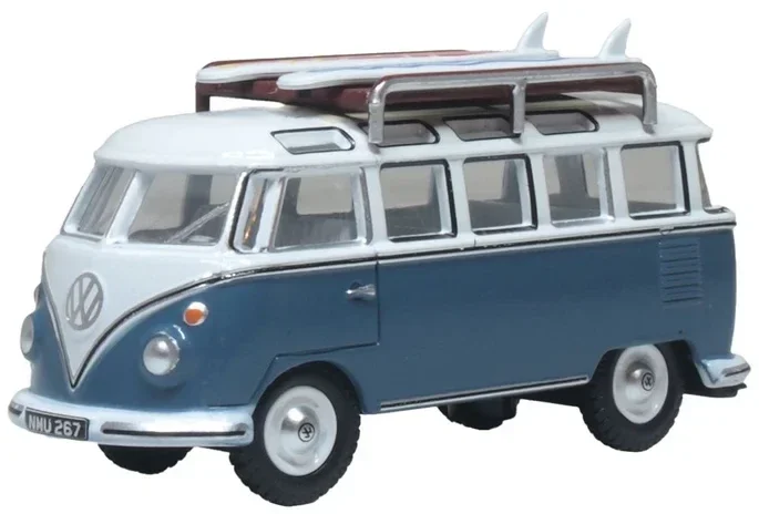 Hier zien we Oxford's topmodel VW T1 Samba busmodel op schaal 1:76 met een zilveren dakrek, compleet met twee felgekleurde surfplanken. De carrosserie is gedecoreerd in felblauw en wit en met witte bumpers en wielen. Het interieur is ook wit met een beige dashboard. Geregistreerd als NMU 267, deze hoort zeker thuis op het strand!